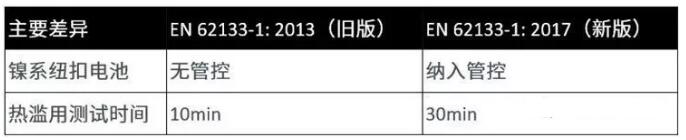 其中,在鎳系電池部分,EN 62133-1:2017與原標(biāo)準(zhǔn)對(duì)比,兩者的差異體現(xiàn)在主要測(cè)試的更新,如熱濫用測(cè)試時(shí)間從10分鐘改為30分鐘。