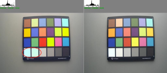 如下圖,左邊的圖整體白平衡誤差明顯,且眾多色塊明顯偏色,這種色彩響應(yīng)對(duì)于消費(fèi)電子行業(yè)的影像效果來說是不能接受的。
