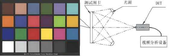 色彩還原測(cè)試應(yīng)在完成自動(dòng)平衡之后進(jìn)行,測(cè)試在D65光源、TL84光源和A光源照明條件下進(jìn)行,測(cè)試圖卡表面照度應(yīng)分別為(800±80) lx、(200±20) lx、(25±2.5) lx;