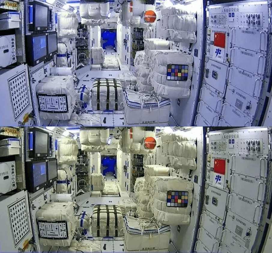 在央視的直播畫面中,我們可以看到一張標(biāo)準(zhǔn)的24色標(biāo)準(zhǔn)色卡,如下圖紅色圓圈中所示。這張色卡是用來實(shí)時(shí)矯正核心艙中攝像設(shè)備的色彩的。太空中的射線是時(shí)刻變化又不可控的,因此拍攝的照片顏色通常也是失真的,這就需要標(biāo)準(zhǔn)的色卡來幫助我們將拍攝的畫面矯正到真實(shí)的顏色。