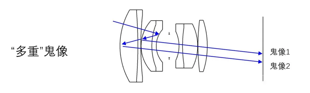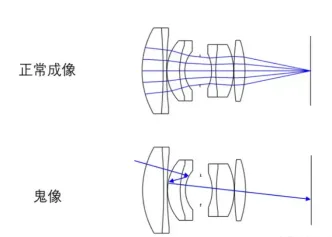 環(huán)境中存在的高亮度目標(biāo)源在鏡頭內(nèi)部各個(gè)透鏡間快速反射,最終在圖像上形成的附加像,其亮度一般較暗,且與原像錯(cuò)開。由于任何兩個(gè)鏡片表面都可能發(fā)生這種現(xiàn)象(應(yīng)該說都在發(fā)生,只是強(qiáng)度不同),兩兩組合可以產(chǎn)生很多光路,因此在這種情況下常常會(huì)形成一“串”光斑。