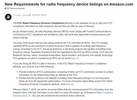 近日,亞馬遜又出新政策了,有關Amazon.com美國站銷售的射頻設備(RFD)必須滿足FCC合規新要求,強調了所有射頻設備(RFD)必須在2022年3月7日前提供FCC合規證明和信息,否則將會下架處理!