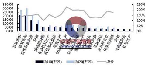 2010年及預測2020年VOCs排放量大于20萬噸的主要行業