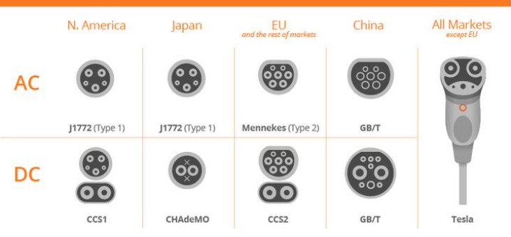 直流充電槍一般也是跟交流充電槍相對應的,每個地區有各自的標準,除了日本有點例外。日本的部分三菱跟日產的新能源車型會用到CHAdeMO直流充電槍接口。