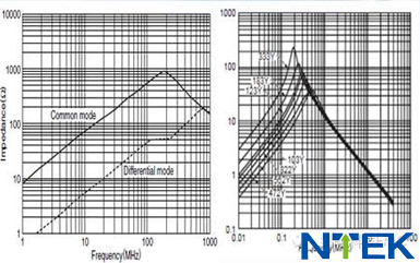大電流共模電感與傳統共模電感的阻抗特性對比圖如下:
