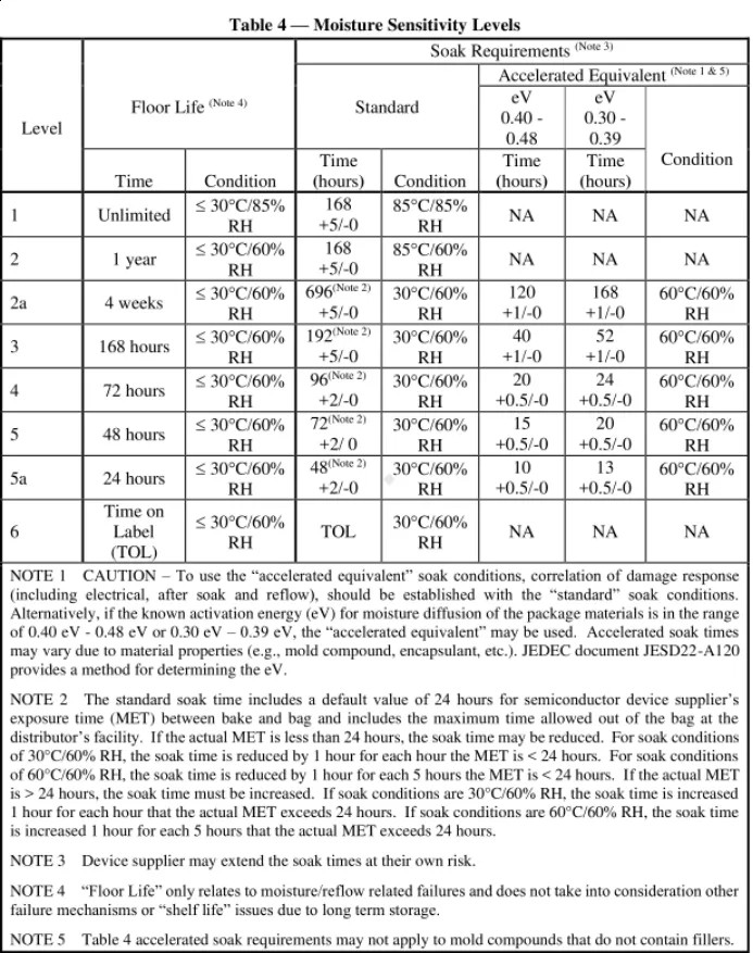 濕度敏感等級(jí)(MSL)的選取應(yīng)參考JESD22-A113/J-STD-020標(biāo)準(zhǔn)。車規(guī)芯片的濕度敏感等級(jí)最低要求為MSL 3。