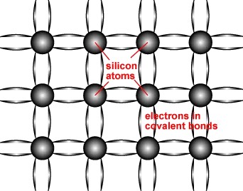 我們目前用得最多的半導體材料,比如硅(Si),是Ⅳ族元素,本身最外層電子為4,可以形成穩定的晶格結構,因此它本身是無法導電的,如下圖所示,所有電子和原子核都被牢牢束縛在穩定的結構中出不來,所以沒有自由移動的電荷。