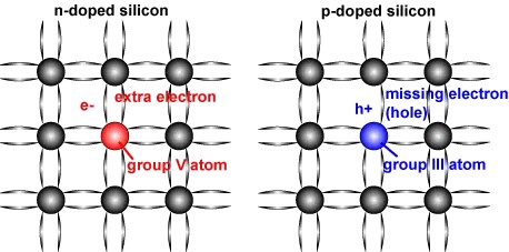 而當材料中摻雜了其他元素,比如說Ⅲ族或者Ⅴ族元素,甚至其他元素,取代了晶格中的位置。摻雜Ⅴ族元素,結構中就有了除了最外層4個以外的一個電子(即多數載流子為電子),摻雜了Ⅲ族元素,結構中就缺了一個電子構成穩定結構,即形成一個空穴(即多數載流子為空穴)。如下圖所示,左圖為摻雜Ⅴ族元素的示意圖,Ⅴ族元素最外層有五個電子,四個電子參與形成共價鍵,因此還剩余一個電子;右圖為摻雜Ⅲ族元素的示意圖,Ⅲ族元素最外層有三個電子,只有三個電子用于形成共價鍵,因此留下一個空穴。為了方便,可以直接將電子和空穴理解成負電荷和正電荷。