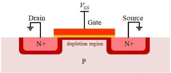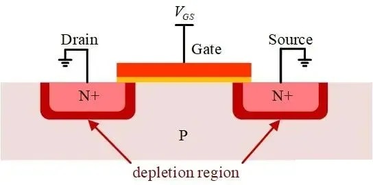 以平面增強型N溝道MOSFET為例,基本結構如下圖所示。可以看到,從左到右為NPN的摻雜,在擴散作用下,會自然形成像圖中所示的深紅色的耗盡區(depletion region),根據前面所述,耗盡區是不能導電的,因此漏極(Drain)到源極(Source)在未加外加電場的時是斷開的,因此該結構是Normal off的結構。