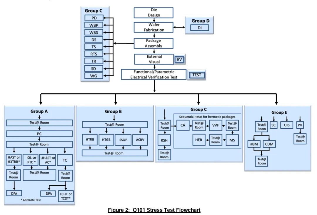 AEC Q101標準是分立半導體器件(依產品類型、封裝形貌及取樣數量的要求)執行并通過的必要測試項目。