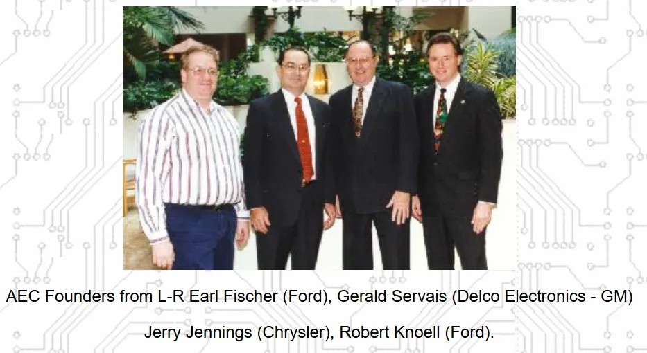 1994 年,克萊斯勒、福特和通用汽車三大主機廠為建立一套通用的零件資質及質量系統標準而設立了汽車電子委員會 AEC(Automotive Electronics Council),符合AEC規范的零部件均可被三家車廠同時采用。此舉推動了汽車零部件通用性的實施,為車載電子市場的快速增長奠定基礎。目前AEC會員遍及全球各大汽車廠與汽車電子和半導體廠商,AEC-Q為AEC組織所制訂的車用可靠性測試標準。