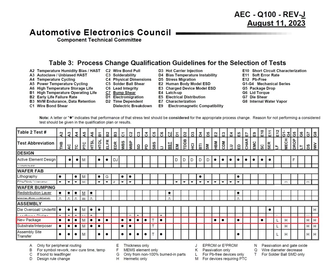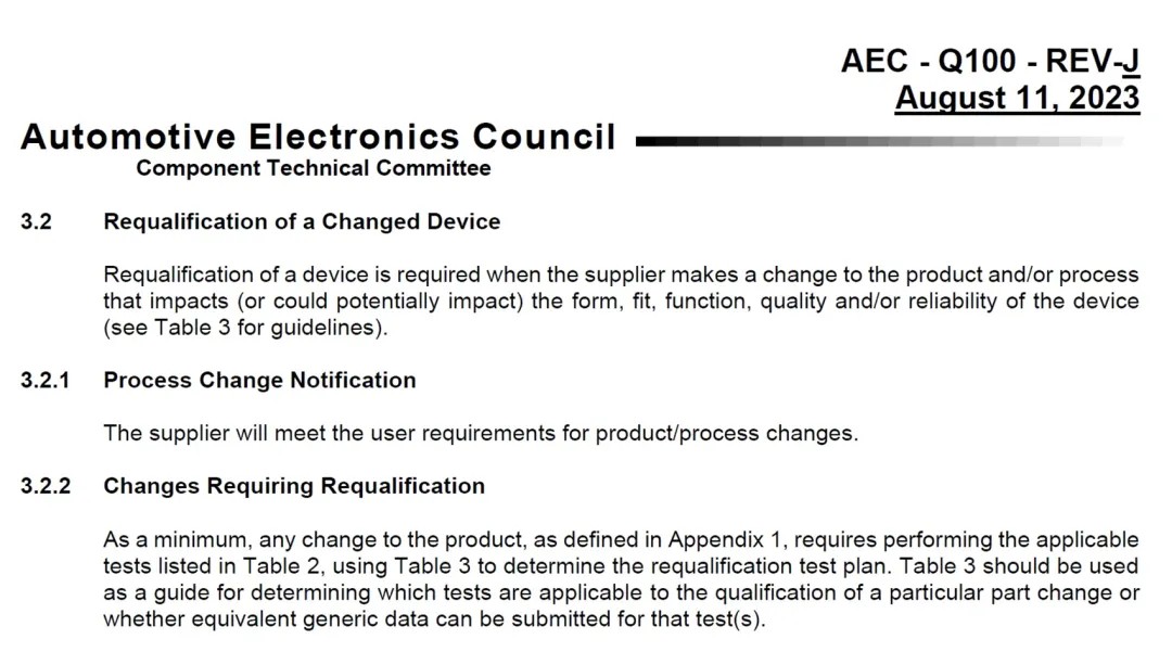 AEC-Q100是汽車電子委員會(AEC)制定的一系列標準之一,專為汽車電子組件的質量認證而設計。當某款車規芯片發生變更時,此時需根據AEC-Q100 3.2.2的要求,執行必要的測試項目,以確保變更后的芯片能夠滿足車規要求。