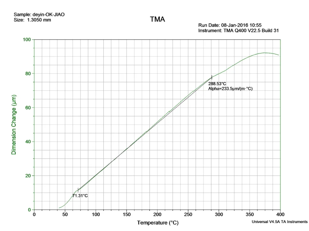 方法:準備尺寸為6.35 * 6.35mm的樣品。將樣品在105℃的烘箱中烘烤2小時,然后放入干燥器中冷卻至室溫。將樣品放入TMA測試儀的樣品臺上,設定升溫速率為10℃/ min。將樣品溫度升至260℃。