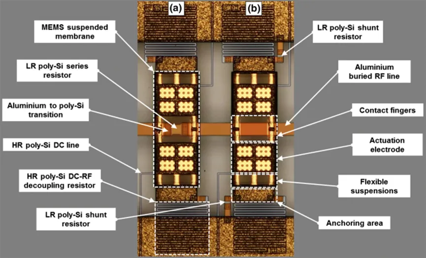 不同聲學(xué)濾波器表面電極的形貌特征. a)SAW 濾波器,b)BAW 濾波器