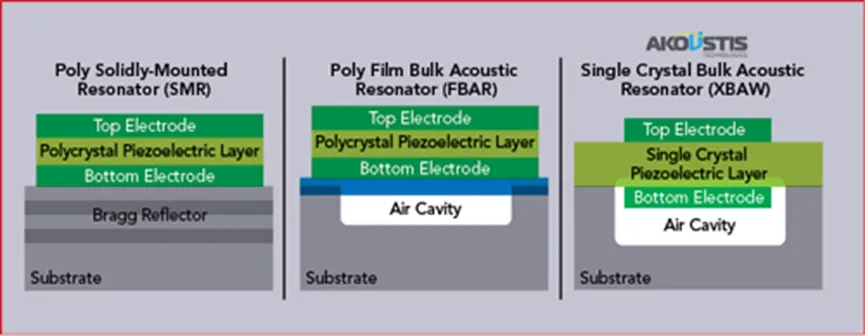 BAW 濾波器. SMR 結(jié)構(gòu), FBAR/XBAR空氣隙結(jié)構(gòu)