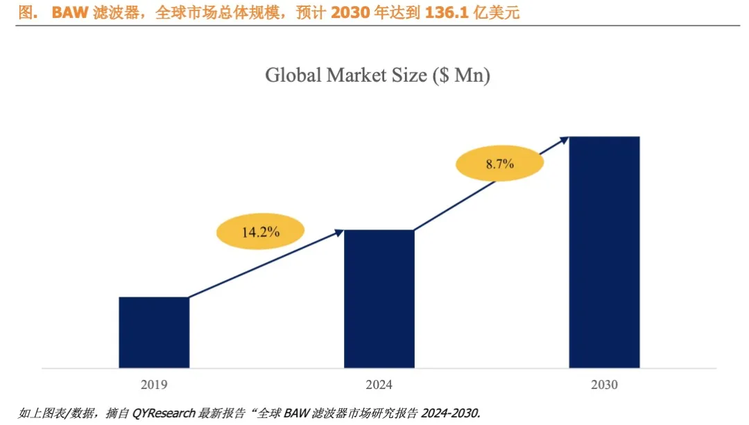 在全球BAW濾波器市場中,亞太地區(qū)占據(jù)了主導(dǎo)地位,市場份額高達(dá)75%。隨著5G通信和智能手機(jī)需求的不斷增長,BAW濾波器市場規(guī)模持續(xù)擴(kuò)大。據(jù) QYResearch 調(diào)研團(tuán)隊(duì)最新報(bào)告“全球 BAW 濾波器市場報(bào)告 2024-2030”顯示,預(yù)計(jì) 2030 年全球 BAW濾波器市場規(guī)模將達(dá)到 136.1 億美元,未來幾年復(fù)合增長率 CAGR 為 8.7%。其中,F(xiàn)BAR BAW濾波器作為最大的細(xì)分產(chǎn)品,占據(jù)了約90%的市場份額,而智能手機(jī)則是其最大的應(yīng)用領(lǐng)域,占比高達(dá)85%。