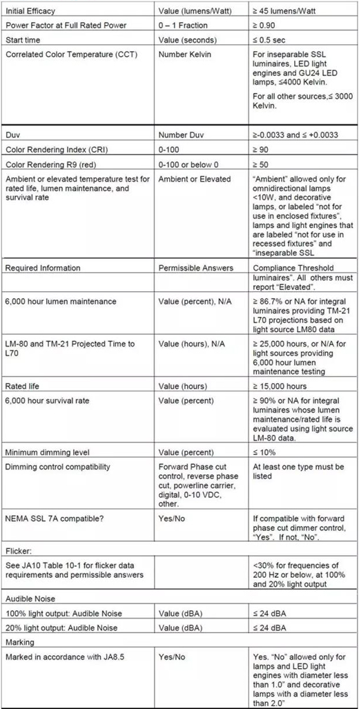 在舊版CEC Title 24中,針對(duì)使用LED光源的家用燈具的性能要求,在Joint Appendix JA8中重點(diǎn)只關(guān)注光效、色溫、顯色指數(shù)等基本參數(shù)。在2016年最新版中,CEC Title 24針對(duì)高光效光源的產(chǎn)品,在Joint Appendix JA8中新增加了許多性能要求。