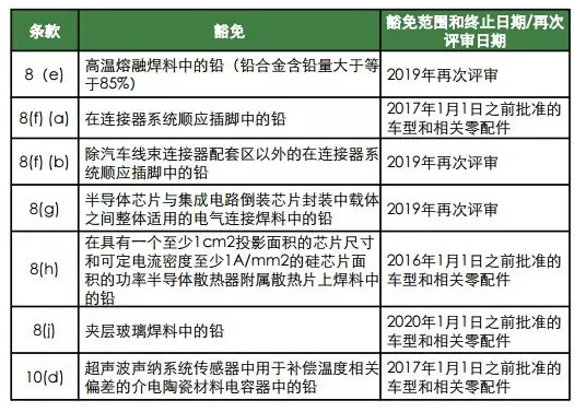根據之前指令規定,2014年應該對條款8(e)、8(f)、8(g)、8(h)、8(j)和10(d)重新進行評估,經過對科學和技術進展的評估,豁免條款8(h)、8(j)和10(d)涵蓋的鉛的應用已經可以避免,因此對應豁免條款的豁免時間不應該被延長;而豁免條款8(e), 8(f) 和8(g)覆蓋的鉛的應用由于未發現合適的替代物而難以避免使用,因此,相應條款引入了一個審查日期,將于2019年再次評審這些鉛的應用是否會被終止。具體修訂條款請見下表: