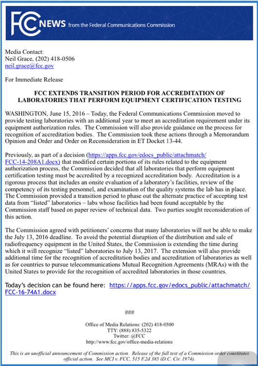 美國聯邦通訊委員會FCC于當地時間15號發布新聞,將繼續接受listed實驗室(主要指中國大陸的)出具的檢測報告申請FCC ID,延長期為一年,直到2017年7月13日,對于中美之間暫無MRA的中國大陸實驗室以及國內的制造企業來講,仍有1年的緩沖期進行調整和適應。