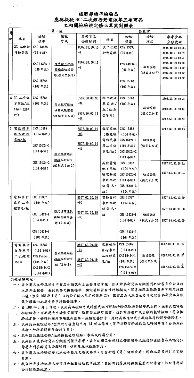 近日臺灣臺灣經濟部標準檢驗局,即BSMI,公告修改3C二次鋰電池與行動電源相對應之貨品分類號列 (C.C.C. Code),并改列為邊境管制商品,自2019年1月1日起實施。修正前參考貨品分類號列之證書將自公告日起停止核發,過去已核發的BSMI認證證書必須自公告日起依修正后參考貨品分類號列申請換發證書。