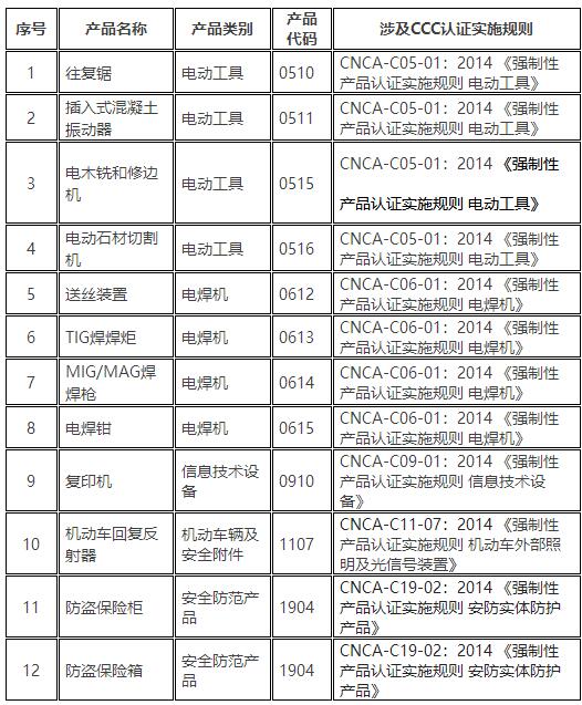 近日,國家認監委官方網站宣告了最近的CCC認證的更新公告,這次更新了12種產品不在屬于CCC認證范圍。往復鋸、插入式混凝土振動器、電木銑和修邊機、電動石材切割機、送絲裝置、TIG焊焊炬、MIG/MAG焊焊槍、電焊鉗、復印機、機動車回復反射器、防盜保險柜、防盜保險箱不再需要做3C認證。
