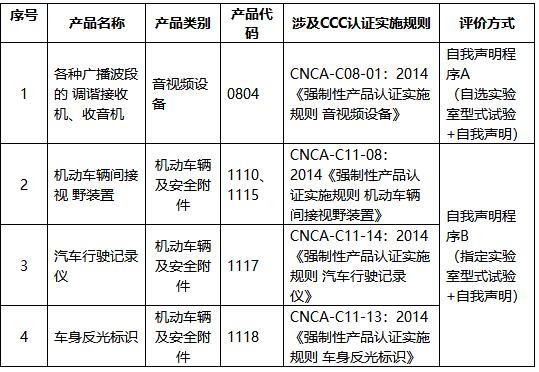 自本公告發布之日起,對12種產品(見附件1)不再實施強制性產品認證管理,認監委注銷相關認證機構和實驗室所涉及的強制性產品認證指定業務范圍,對應指定認證機構應注銷已出具的強制性產品認證證書;對4種產品(見附件2)轉為自我聲明評價方式,相關企業可選擇由指定認證機構按既有方式進行認證,也可依據《強制性產品認證自我聲明實施規則》采用自我聲明方式證明產品能夠持續符合強制性產品認證要求,并完成產品符合性信息報送。