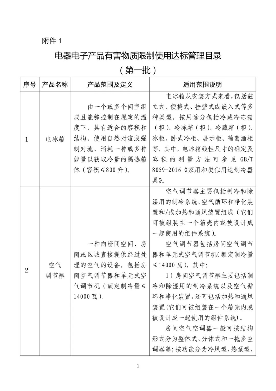 明天起電冰箱、空氣調節器、洗衣機等12類電子電器產品將會對鉛、汞、鎘、六價鉻、多溴聯苯和多溴二苯醚6類物質含量納入中國RoHS標準。1年前工業和信息化部發布了《電器電子產品有害物質限制使用達標管理目錄(第一批)》和《達標管理目錄限用物質應用例外清單》,并將于2019年3月15日正式施行。
