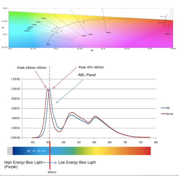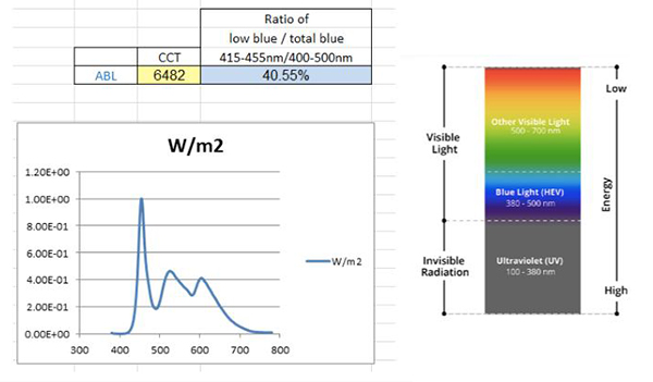 此時屏幕已經看上去偏藍了,如果還認為是低藍光的話,一般消費者會很難接受,因此我們把上述的比值大幅度降低到5%以下。就是有害藍光波段(415-455nm)的能量與整個藍光波段(400-500nm)的能量比值不能大于5%