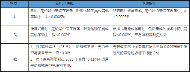 其中,在電池有害物質管控部分,電池法規新增了便攜式電池的“鉛”含量的強制限值要求,且要求滿足歐盟REACH法規附錄XVII和歐盟ELV指令,新舊歐盟電池法規限制物質要求對比如下表: