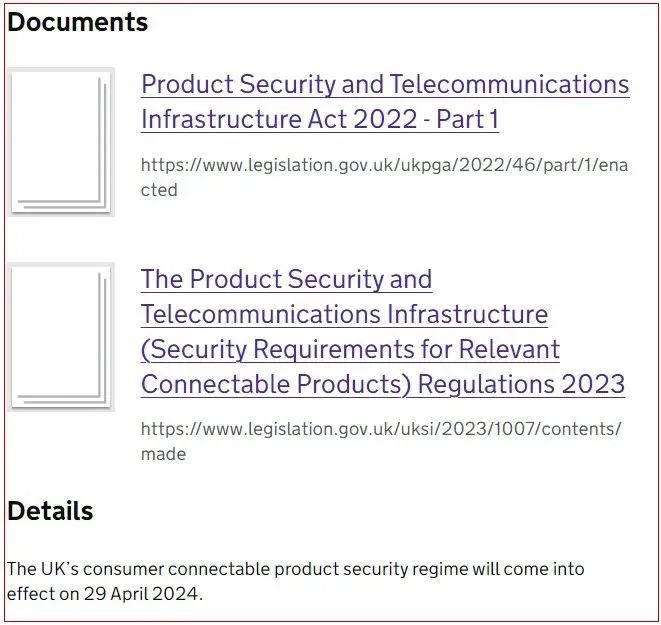 PSTI法案于 2022 年 12 月獲得批準。政府于 2023 年 4 月發布了PSTI (相關可連接產品的安全要求)法案的完整草案,這些法案于2023年 9 月 14 日簽署成為法律。消費者可連接產品安全制度將于 2024 年 4 月 29 日生效。